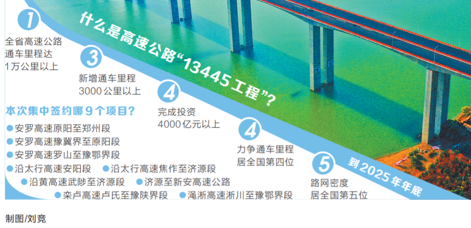 高速公路“13445工程”是省委省政府站位全局作出的重大战略决策,即到2025年年底,全省高速公路通车里程达1万公里以上,新增通车里程3000公里以上,完成投资4000亿元以上,力争通车里程居全国第四位、路网密度居全国第五位。