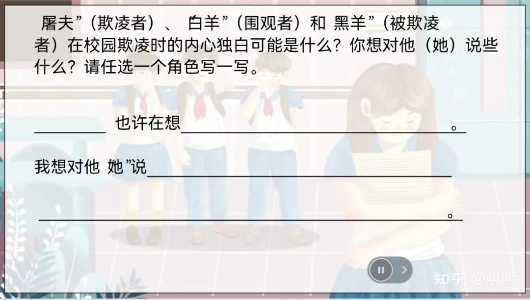 课程以一个有趣的“花式握手”小游戏展开,让孩子们感受同学之间难得的友谊和融洽的关系。再由一通求助电话导入本课话题。 了解完校园欺凌的六大形式后,教师导入“黑羊效应”。让学生观看视频,在舒缓音乐背景下静心思考,感受欺凌者、旁观者和被欺凌者这三个主体的内心独白。