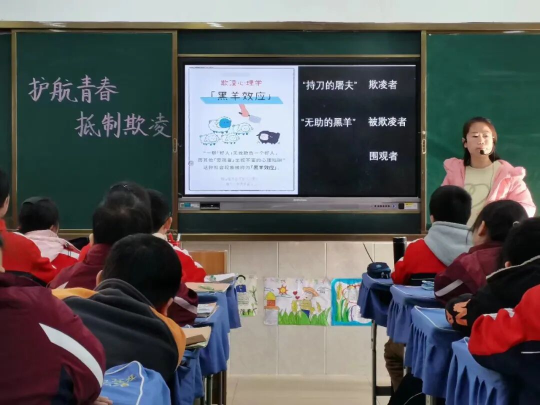 心理健康教育 通过一张纸的实验,具象化学生对校园欺凌的认识。“不参与!不旁观!不沉默!”,杨老师本节课在注重学生感受和分享的基础上,在学生心间种下一颗抵制校园欺凌的种子,也为正被校园欺凌和旁观欺凌的同学们注入了对抗欺凌的勇气和力量。 本节课从最初的课程设计,课前的问卷调查,板书的巧妙设计,数次的磨课到最后的成功呈现,无不体现出胜利路学校“心之翼”团队的集体智慧。