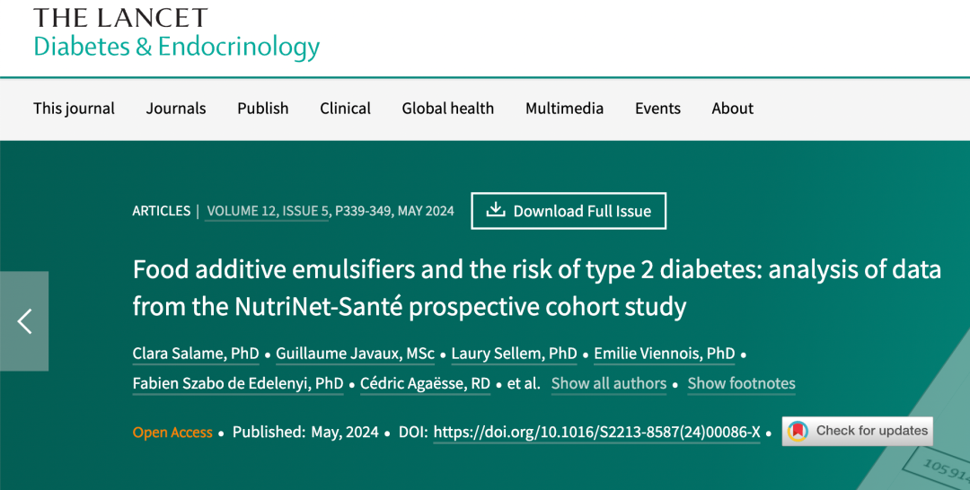 [1]Clara Salame, Guillaume Javaux, Laury Sellem, et al. Food additive emulsifiers and the risk of type 2 diabetes: analysis of data from the NutriNet-Santé prospective cohort study[J],The Lancet Diabetes & Endocrinology,Volume 12, Issue 5,2024,339-349.